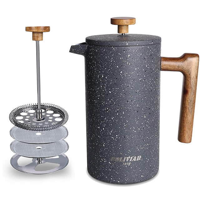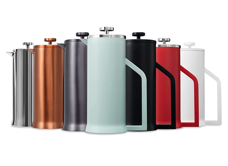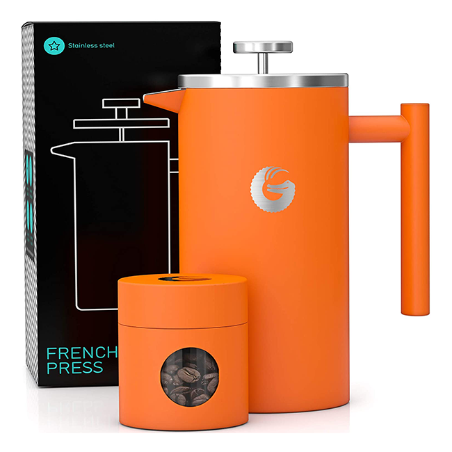 Belwares is a company that knows a thing or two about kitchen equipment and, consequently, brewing coffee. Their beautiful products have been gracing and enhancing kitchens and tabletops for some time now, and their French press is just another extension of the good work they’ve been doing. Constructed of premium stainless steel and coated with a beautiful matte finish, Belwares’ French press is not only durable and high-performing but beautiful too. Like other presses on this list, it uses double-walled, vacuum-sealed technology in order to keep coffee hot for extended periods. It’s available in 34oz and 50oz models and has beneficial interior measuring markings to help you know exactly how much water you’re adding and coffee you’re brewing.